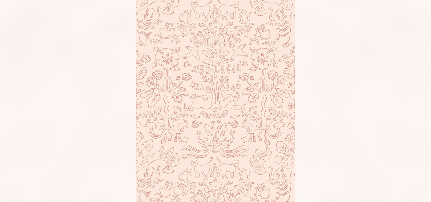 Escape to a peaceful world where pigs fly and moments of magic are around every corner. Soft line work and folk art and toile influences come together to create a gentle, meandering landscape where anything is possible. Designed in collaboration with Emily Isabella.