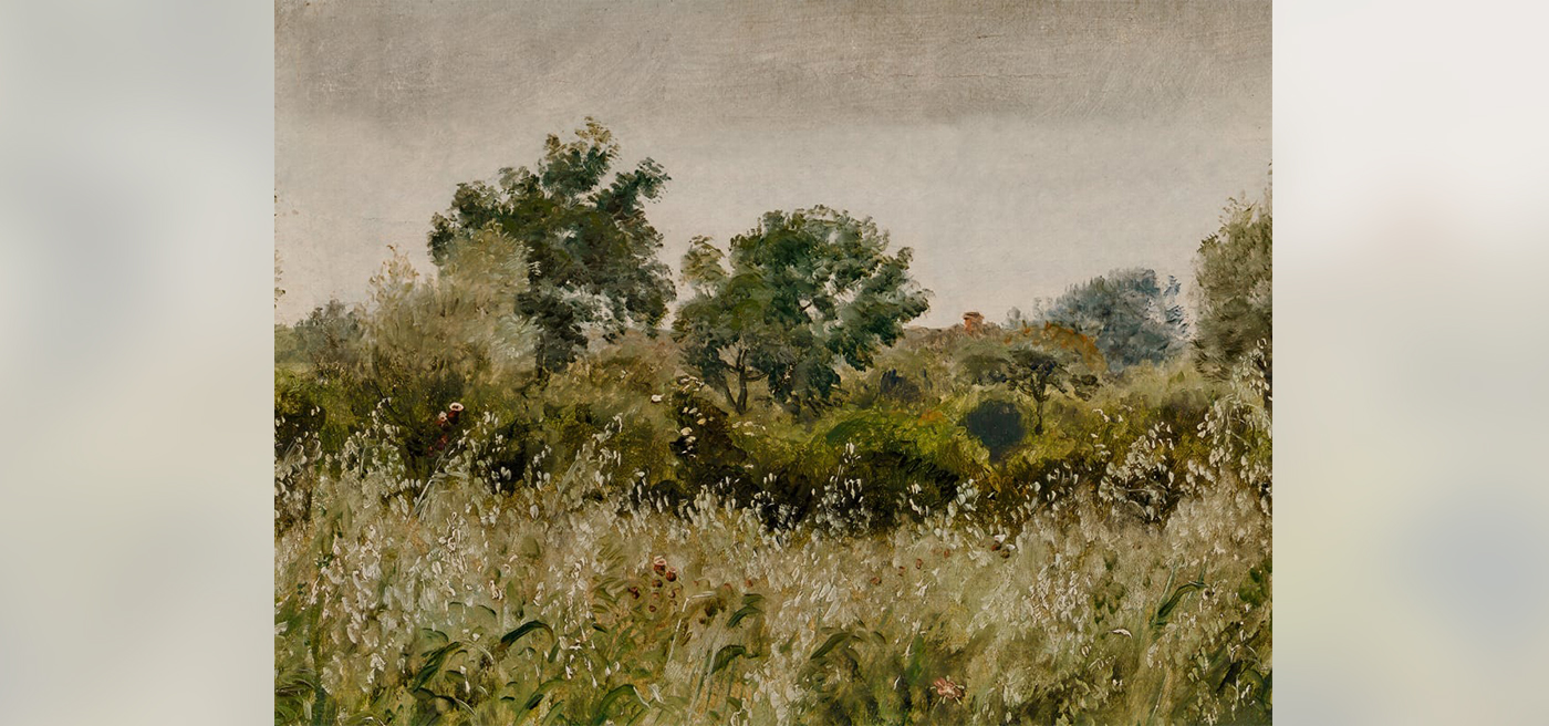 Lay claim to your personal retreat with this summer landscape scene. The wallpaper reveals a lush oatfield surrounded by verdant trees under a soft gray sky. The tranquil greens and muted earth tones evoke a sense of peace and connection with nature. Ideal for those seeking a touch of botanical beauty to personalize their space.