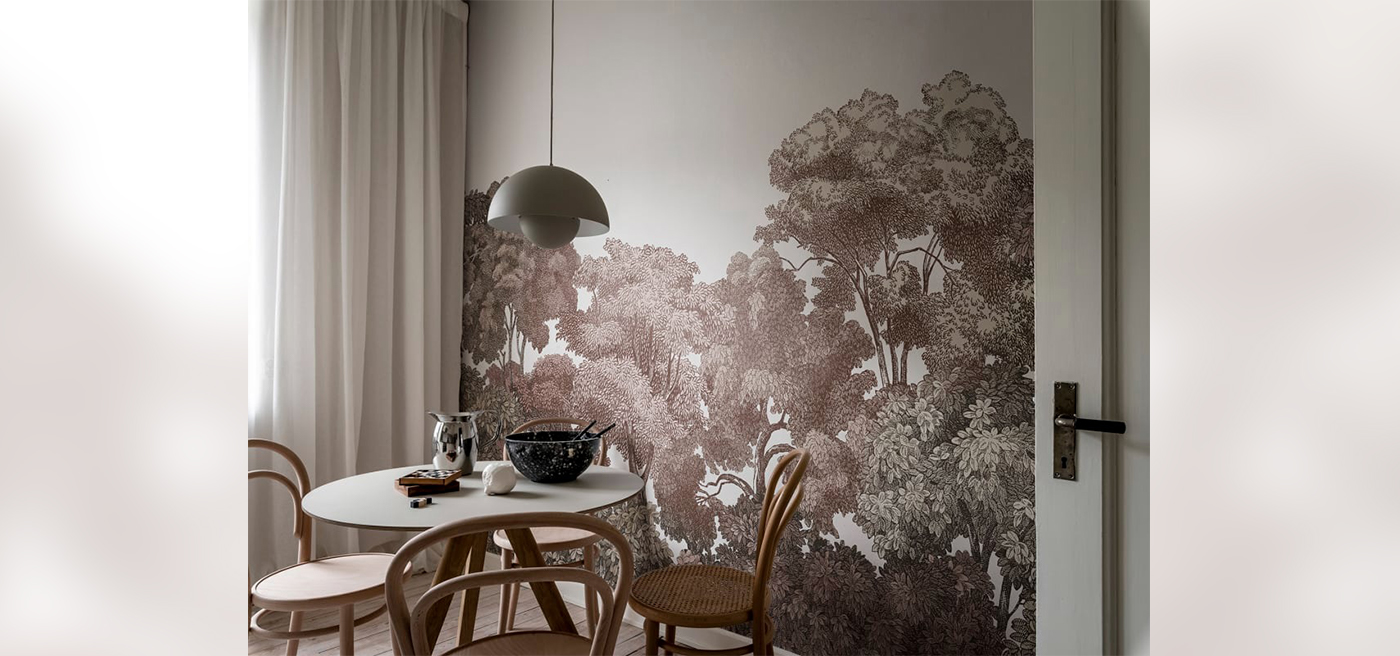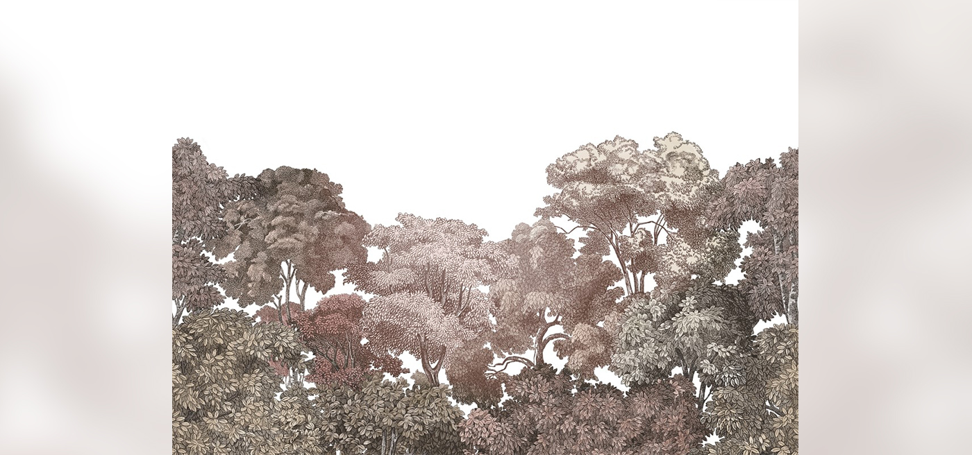 There is something indescribably beautiful about a classic toile pattern based on small hand-drawn strokes painting up romantic scenes usually consisting of lovebirds talking in the shade. We wanted to create a modern toile but maintain the traditional craftsmanship. This inviting, and a little mysterious, forest wallpaper is based on several toile designs where we only picked the trees from the romantic sceneries. If you want to fill the woods with a love message of your own, you can always use our design studio to carve your beloved's name in one of the tree trunks.