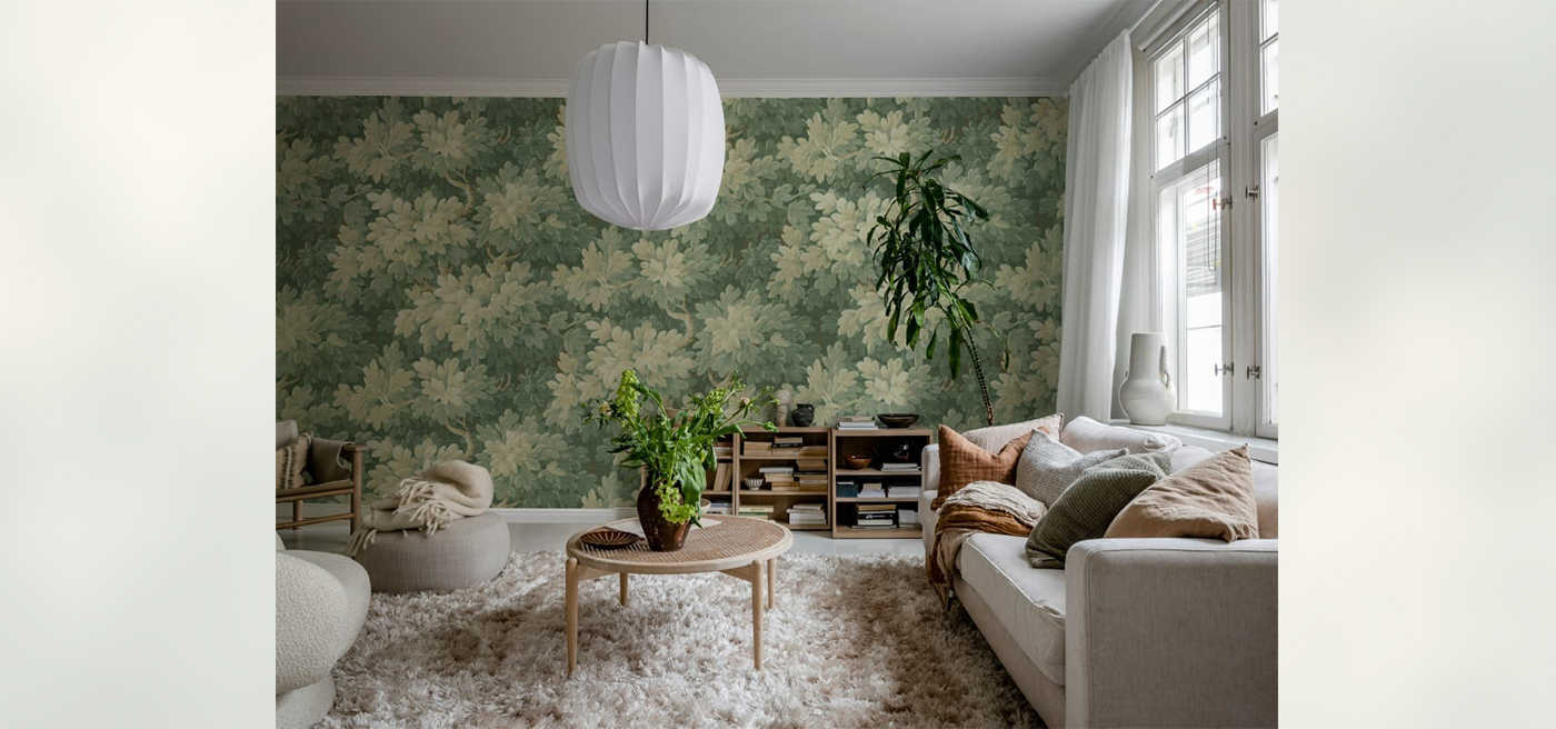 Vintage Foliage is inspired by an original, beautiful tapestry, capturing its timeless charm and texture. The design features lush foliage, enhanced by a textile-like texture that adds depth and an exclusive vintage feel and look. The Light Green colorway comes in soft green and brown hues.