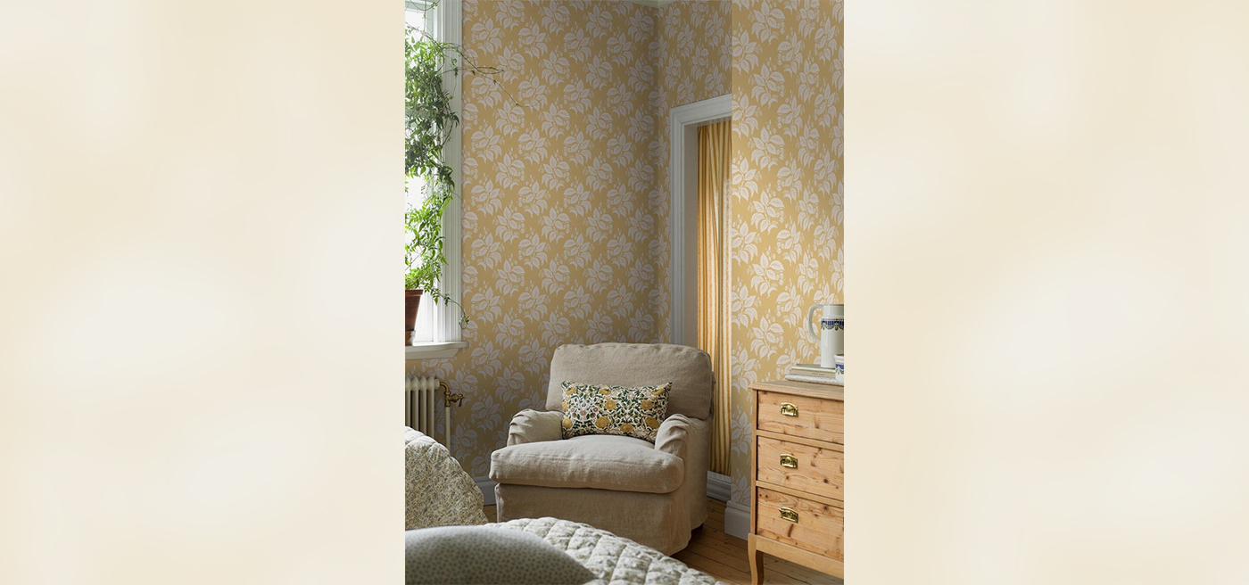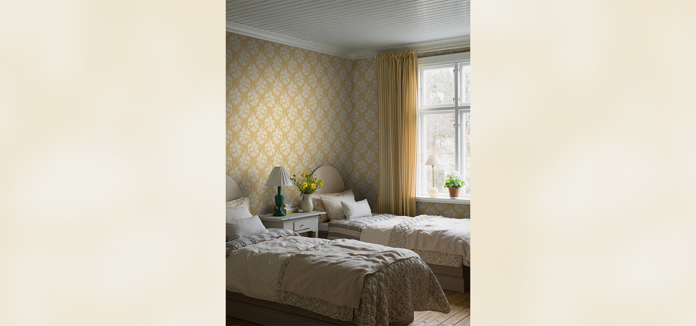 Our Tengbergska wallpaper offers a warm and cheerful take on an early 19th-century French wallpaper design, featuring a grey and white print on a yellow background. This pattern is taken from the Nordiska Museet’s collection and features lush leaves and delicate flowers that dress walls with elegance and refined historic character.