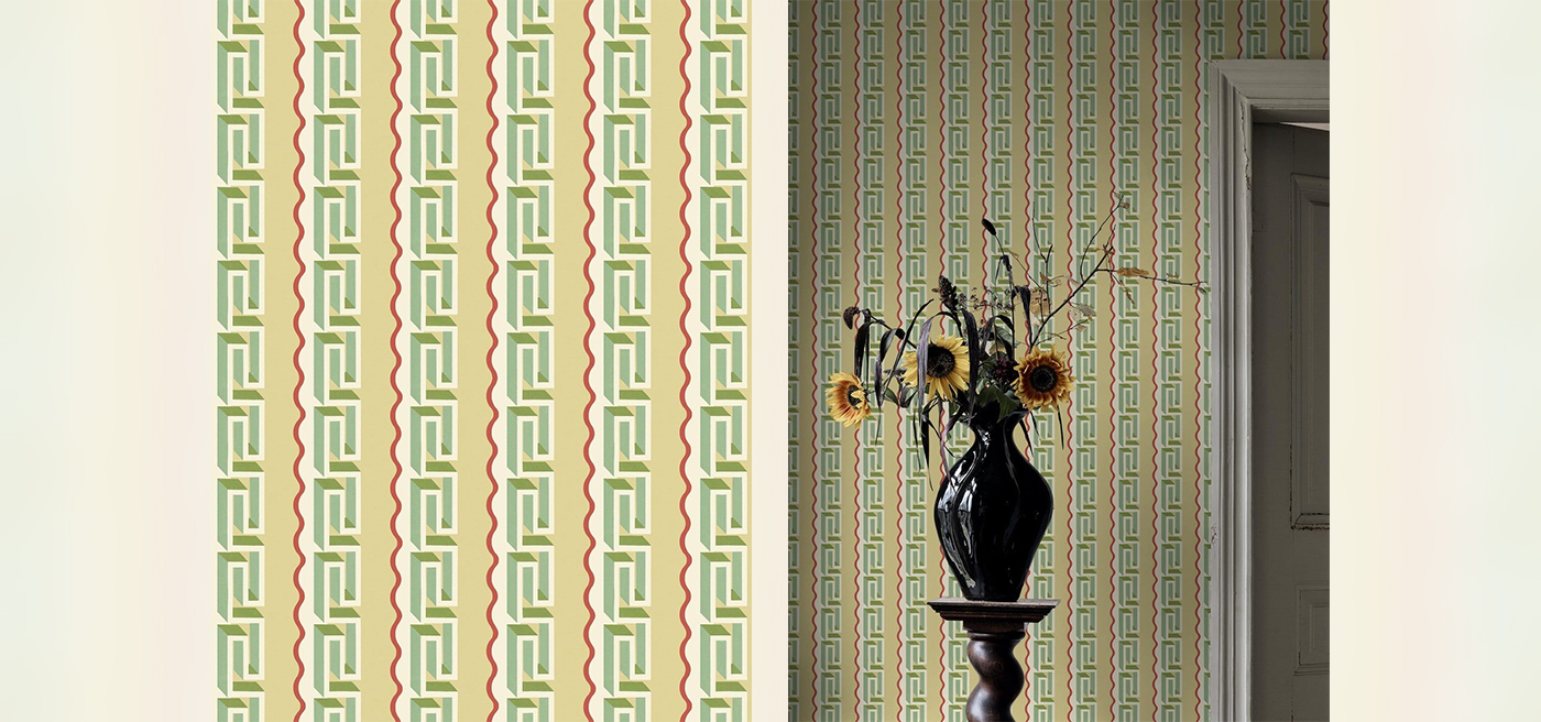 The graphic Rayure Méandre wallpaper creates a striking impression with its large-scale meander motifs. The design is a modern reinterpretation of a pattern from our historical archive – a timeless, elegant wallpaper full of character. Shown here in a green colorway. Wallpaper printed on demand, custom fit to your wall.