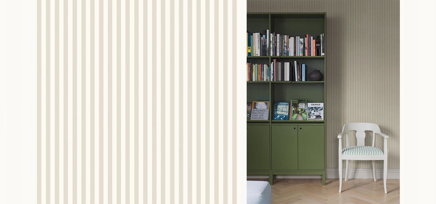 Mölle Stripe is a striped wallpaper inspired by the classic Swedish seaside town of Mölle in Skåne – known for its free-spirited bathing culture at the turn of the 20th century. With timeless design and a hand-drawn feel, this wallpaper brings an airy, harmonious, and cosy atmosphere to any room and style.
