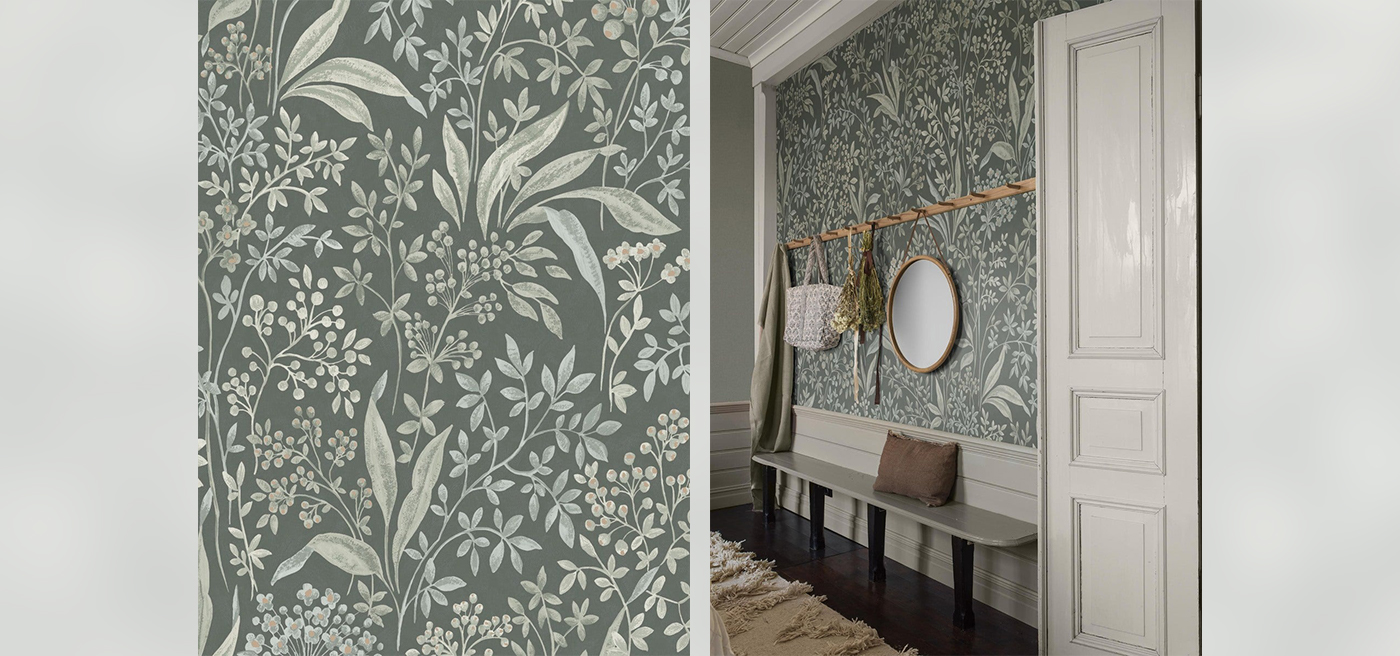 Nocturne Grand is a mural wallpaper featuring winding leaves, small flowers, and seed pods – a large-scale pattern softened by the chalk-like surface of the background. A harmonious wallpaper with an artistic expression. Here shown in muted dark green, light olive, and linden green with small beige details.