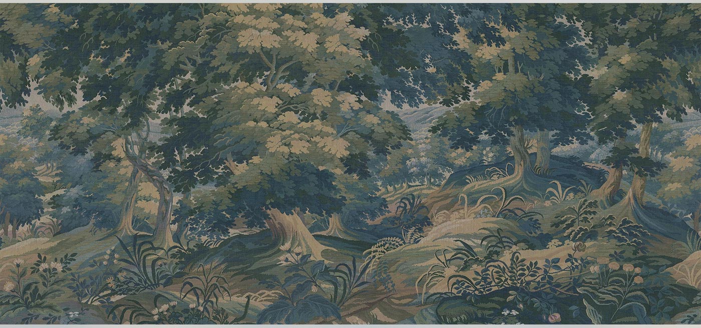This wallpaper comes in an atmospheric palette of green, yellow-beige, blue, brown, and turquoise tones. The wallpaper is digitally printed and custom-sized to fit your wall.