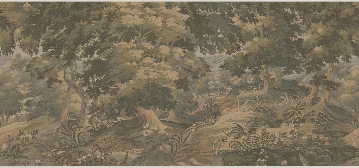 A rolling landscape with stunning depth stretches across the Tapestry Landscape mural – from delicate foreground flowers to lush tree canopies and hazy blue hills in the distance.