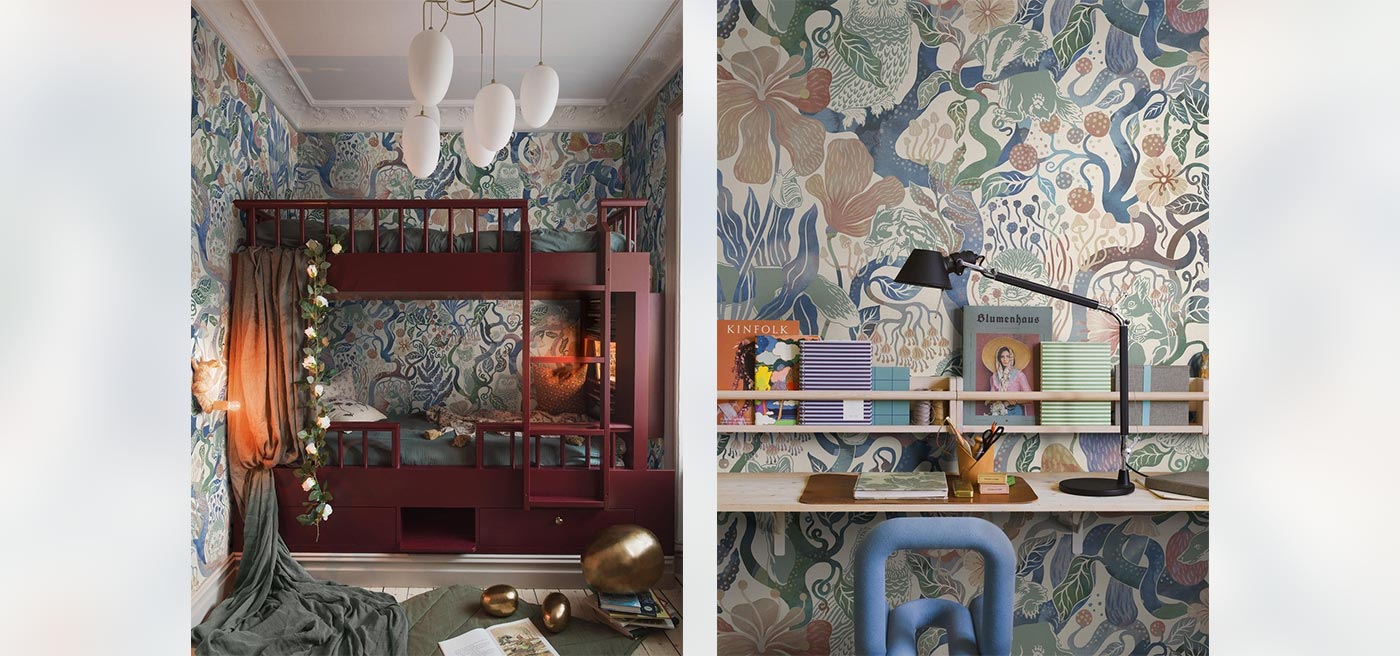 Magic Woods Grand is an enlarged digital reprint of the children’s wallpaper of the same name.