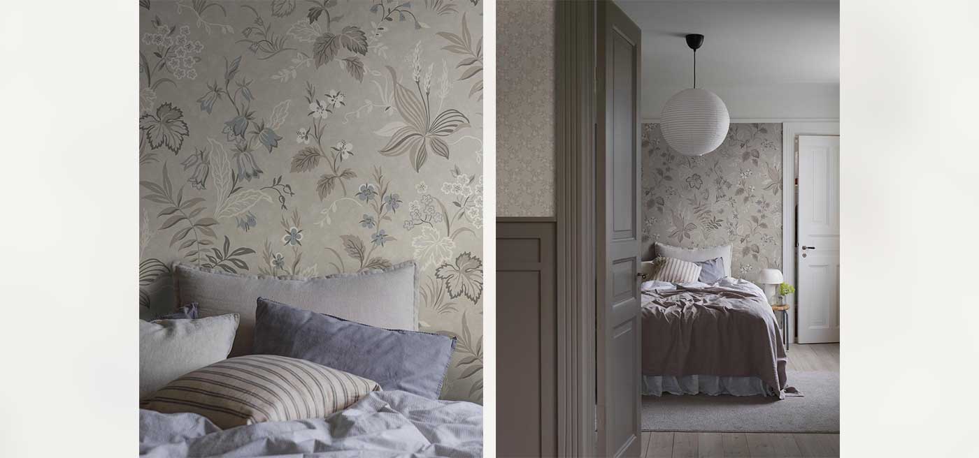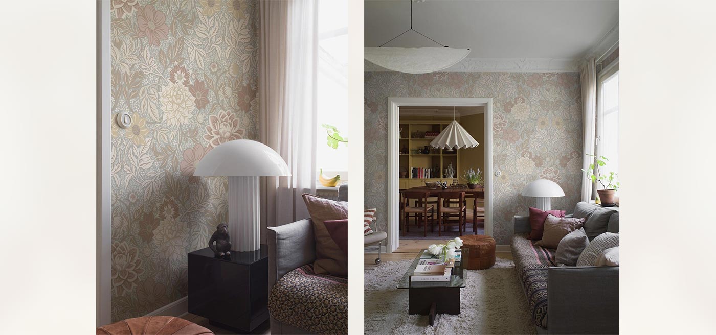 The large-scale Dahlia Garden Grand wallpaper is an enlarged reprint of our modern classic, Dahlia Garden. The hand-painted floral ornament feels warm and harmonious, and at this scale it also gives the room extra character.