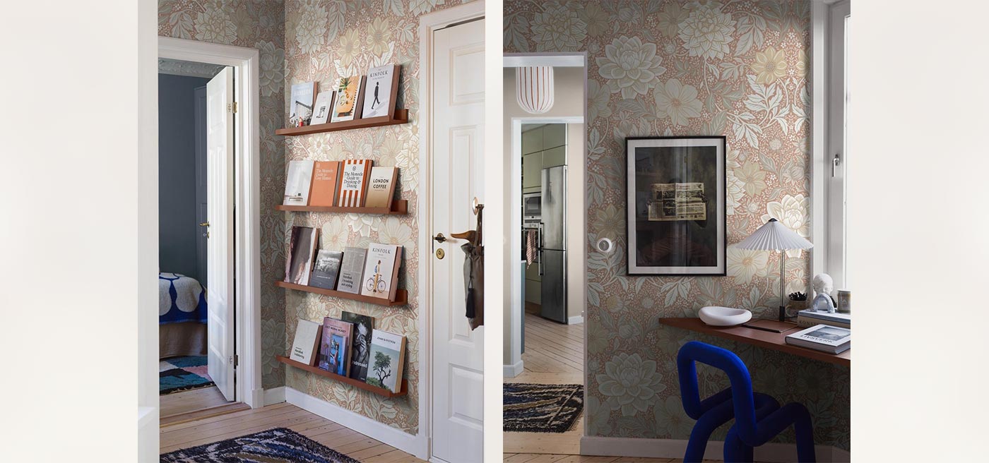 Dahlia Garden Grand is an enlarged digital reprint of our floral Dahlia Garden wallpaper. The luxuriant, hand-painted Arts & Crafts motif gets full room to shine on a truly large surface!
