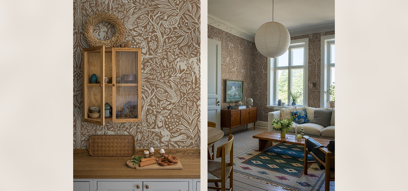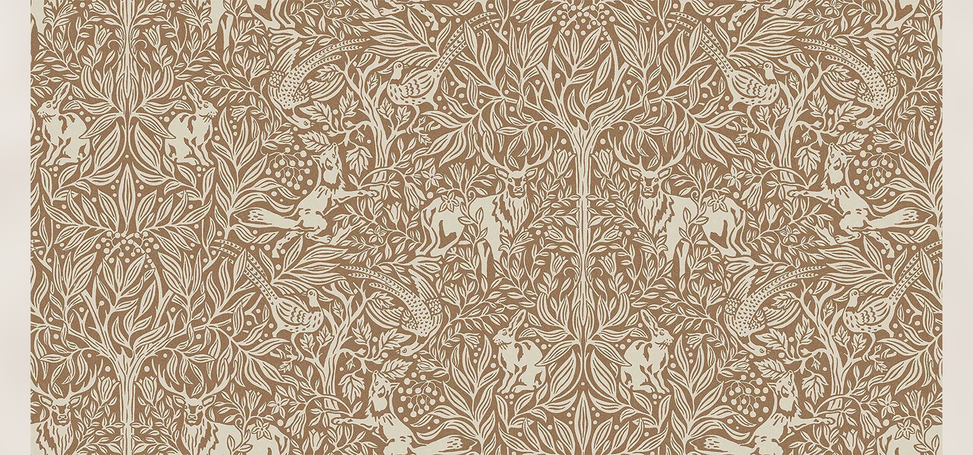 This is an enlarged digital reprint of the Under the Elder Tree wallpaper. Here, the wallpaper has a warm reddish-brown background with light gray-beige details.