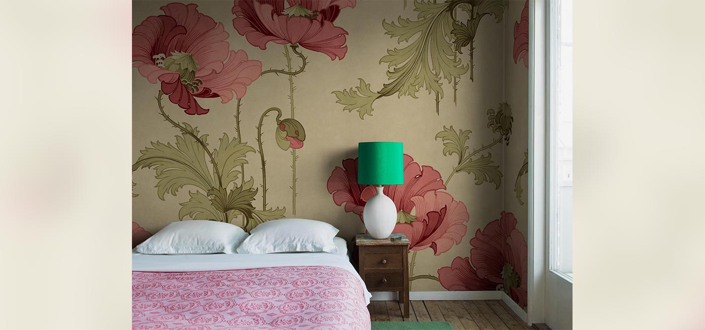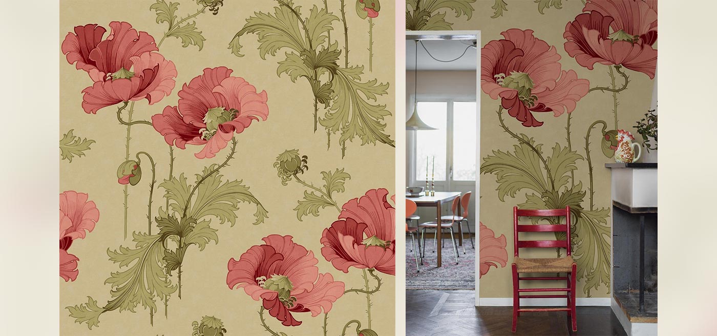 This magnificent mural wallpaper with large-scale poppies is based on an Art Nouveau pattern from the early 1900s. Across its surface is a discreet, textile-like grid that gives this large-flowered wallpaper a soft, and cosy feeling.