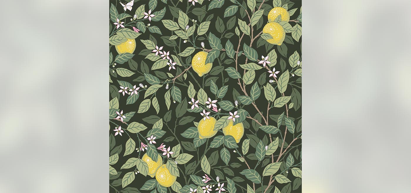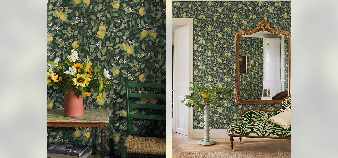 Coloured in contrasting tones of green with white, pink, yellow and brown detailing, our Citronträd wallpaper is vibrant and lush. Designed by Jenny Hahne Gadd, the bold hand-painted pattern combines green foliage, fresh lemons, delicate flowers and beautiful butterflies to create a lively wallpaper that captures the essence of sunny Mediterranean groves.