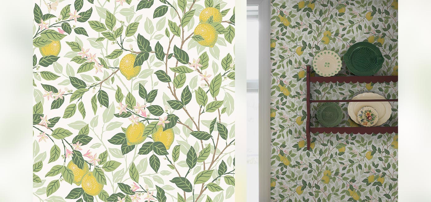 Experience the calm yet lively charm of our Citronträd wallpaper in a light palette of white, green, beige, pink and yellow tones. Dense and detailed, the Arts and Crafts inspired pattern is designed Jenny Hahne Gadd. Its refreshing foliage complemented by delicate flowers and sunny lemons evoke the charm of the Mediterranean groves.