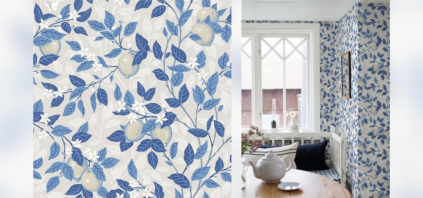 Printed using our traditional surface printing press, the Citronträd wallpaper features a gentle light beige base with classic blue tones adorning the leaves and stems of the lemon tree. The fruits themselves are rendered in a soft beige hue, and blend beautifully into a classic blue-and-white interior design.