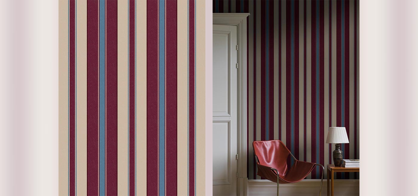Here you see Stockholm Stripe in a calm and elegant, yet also cosy colour palette. The stripes are rendered in tones of beige and burgundy, with occasional bright blue stripes as an accent.