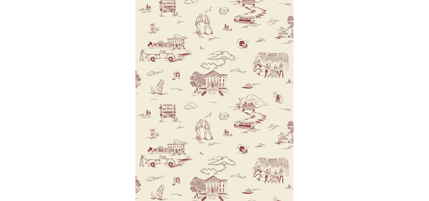 Hop a ride with us—destination: 1955—as traditional toile gets a DeLorean-fueled makeover with a blast from the past in this design inspired by the beloved 1985 film Back to the Future. Designed by Annie Brady