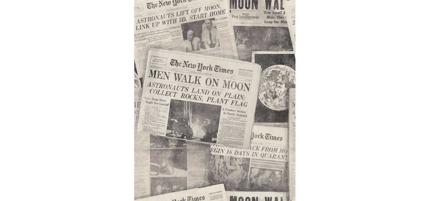 Vintage collage of newspaper headlines in honor of the historic moon landing.