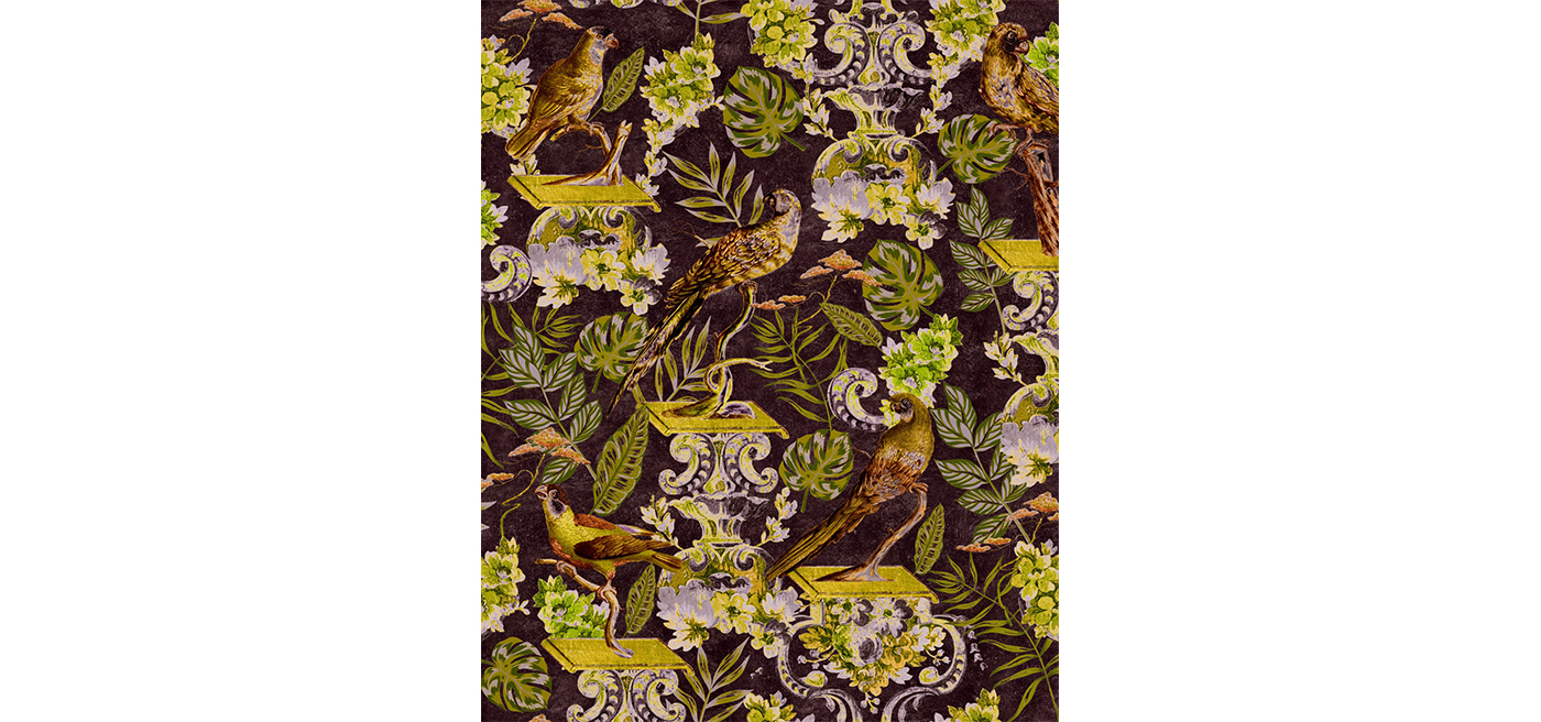 A statement aviary wallpaper with large scale parrots and foliage illustration recreating the look of a royal large bird cage. A wallpaper designed on 3 rolls for maximising the pattern repetition. Available in 3 colour options - Green, Indigo and Dark - and also on velvet fabric on a dark background. The design is printed over 3 rolls.