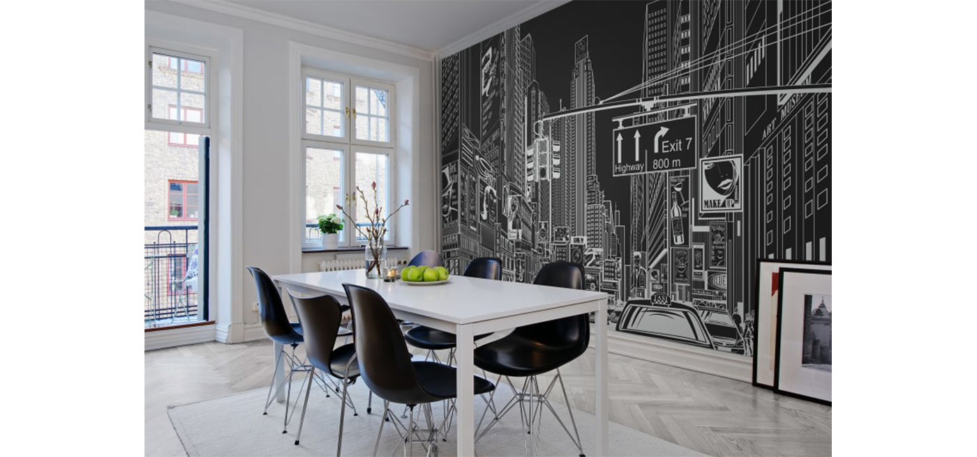 Metropolitan pulse with graphic feel. A wall mural of a cartoon city street bustling with people and traffic.