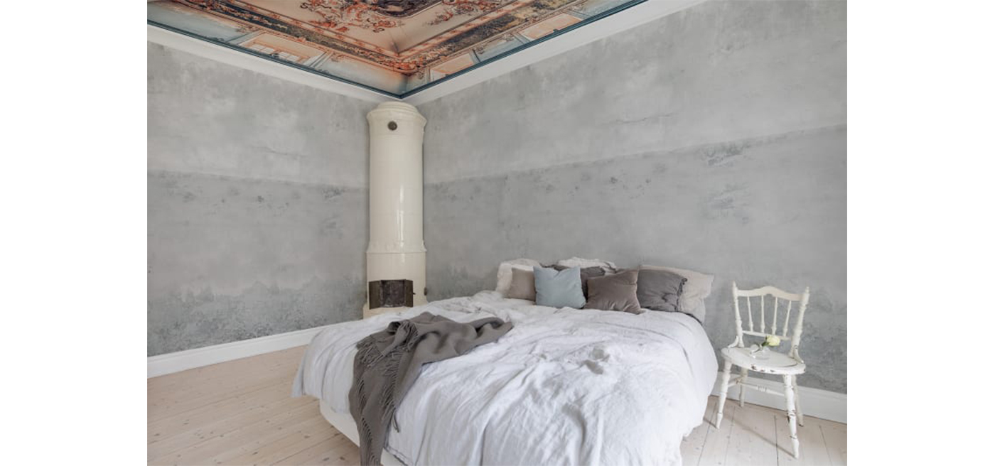 A beautiful surface for those who want to create a space with soul and history. The horizontal line in the middle of this wallpaper is interesting and beautiful to work with later on when you decorate the rest of the room.