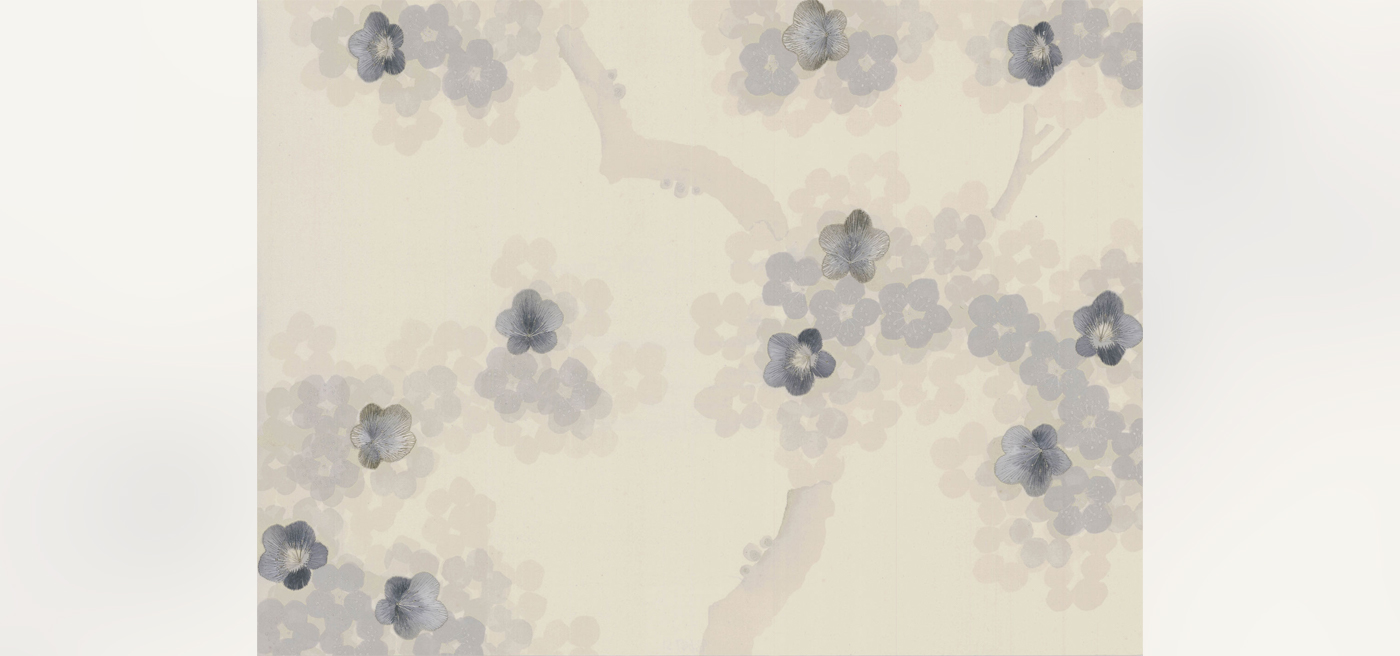 Taking inspiration from the delicate petals of cherry blossoms in full bloom, washes of paint are overlaid forming a ghostly layer of blossoms. This becomes a subtle backdrop for the exquisite hand-embroidered blossoms to take centre stage.