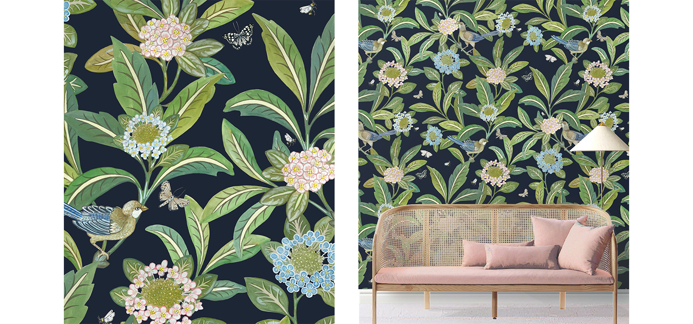 This design is inspired by an Indian summer garden at dusk, when the flowers are at the their most aromatic. All the insects are buzzing around the flowers just before they pack up and head home for the night. The garden is dense with large leaves as the birds and butterflies frolic about.