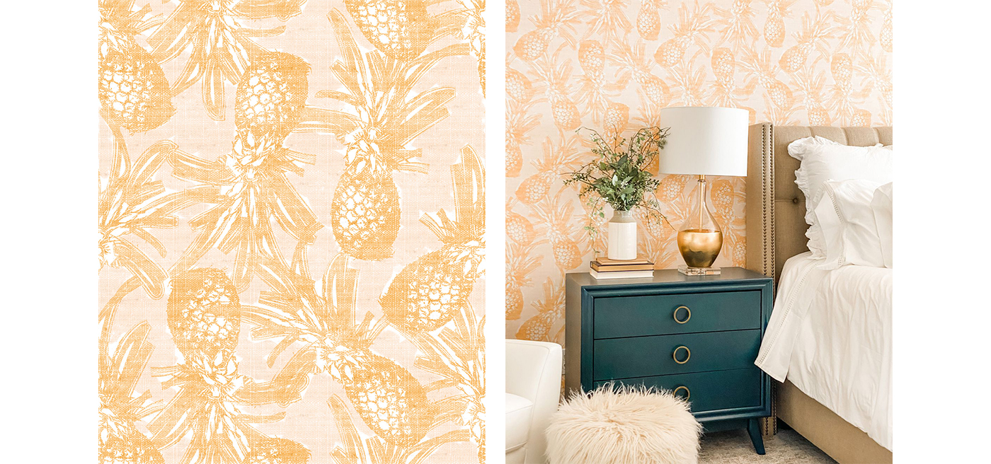 A pineapple wallpaper like nothing else you’ve seen before. This design is truly free hearted, a syncopated dance of pineapples in African rhythms, tossed around and celebrating in wild abandonment. The retro textural detail and muted sun-bleached palettes transport you to a cane furnished patio drenched in the afterglow of a sweltering day. You can hear dragonflies, laughter, rhythmical drums and ice tinkling in glasses; it’s hard not to smile when you feel like you are permanently on a tropical holiday.