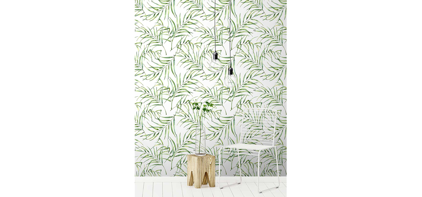 The Palm Breeze Wallpaper is a fresh, modern design that promotes a relaxing and laid back environment, and daydreams of tropical island life.