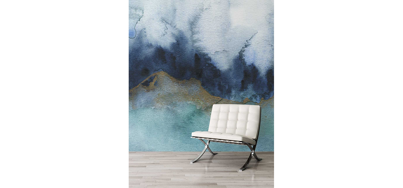 A striking designer wallpaper mural that has a sophisticated and elegant finish. The touch of gold to compliment the teal and grey watercolour strokes offers a luxury wallpaper that will impress in your living room, bathroom or kitchen.
