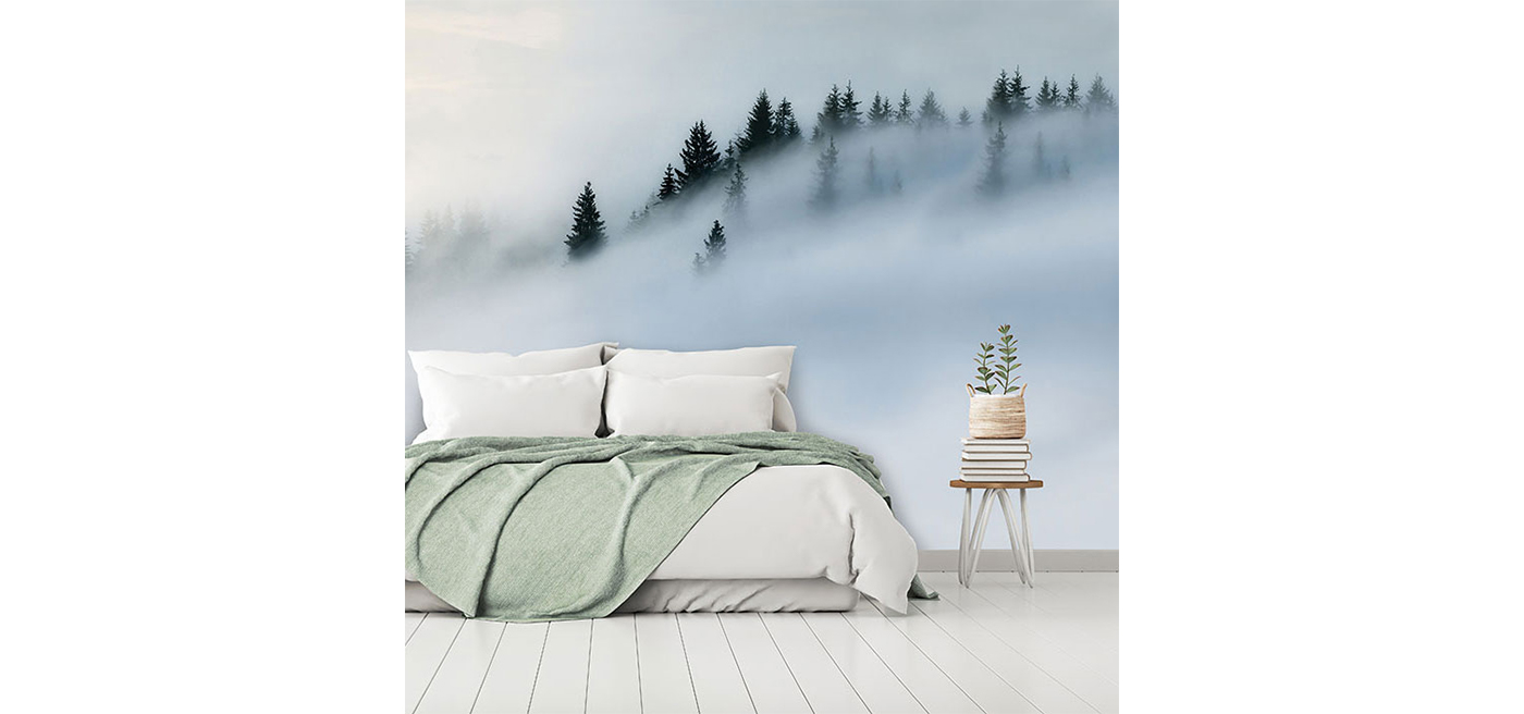 Shimmering through the mist hanging above the Carpathian mountains, a row of pine trees are wrapped in clouds. This is a charming misty forest wall mural that evokes a calm and reflective mood, making it ideal as a mood piece in a bedroom or living room.