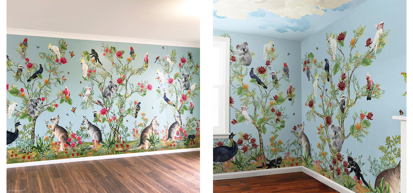 AUSTRALIA is our Australian themed chinoiserie inspired wall mural design filled with lush and captivating native flora and fauna sure to transport any interior into a luxury Australian getaway.