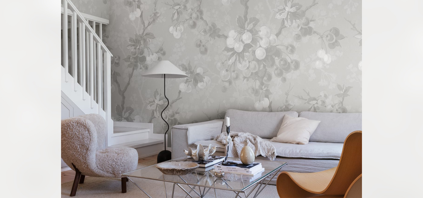 A botanical fairytale world comes to life in this wallpaper filled with enlarged cherries that spark your fantasy and makes your whole room smile.