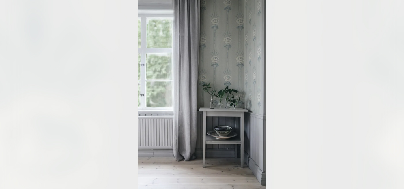 Margareta Powder Blue is a wallpaper with a beautiful original pattern, dating from the 1910s. The richness in detail with pillar-like stripes and proud carnations gives the room a contemporary and appealing elegance. Margareta is available in three colour settings.