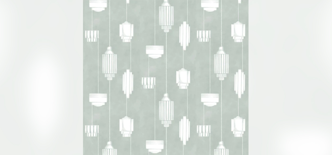 This over-scaled wall covering pattern recalls the 1920s Jazz Age and the luxury and glamour of art deco movie houses, theatres and cruise ships. Strands of beaded chains and glass lanterns hang in midair on hand-painted metallic backgrounds.