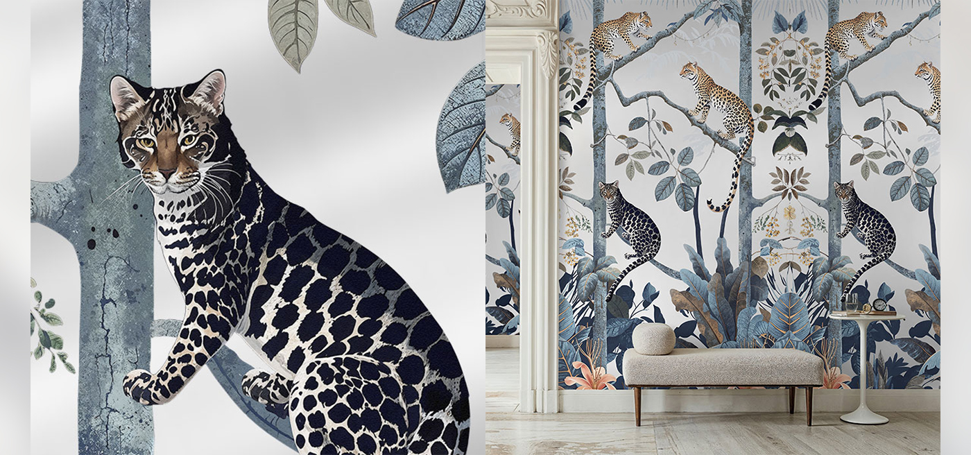 Embrace the luxurious warmth of “Panthera Gold,” a sumptuous gold jungle leopard wallpaper that is the epitome of an elevated tropical wallpaper. Crafted with an eye for intricate illustration detail, this high-quality wallpaper showcases majestic leopards lounging amongst rich, gold-infused foliage, creating a composition that radiates sophistication. The “Panthera Gold” gold jungle leopard wallpaper lends itself to a diverse range of interior design schemes, from the ornate and glamorous to the sleek and modern. Perfect for those who desire to add a touch of opulence to their surroundings, the “Panthera Gold” gold jungle leopard wallpaper is a versatile choice, guaranteed to infuse any space with an air of exotic elegance and a hint of designer intrigue.