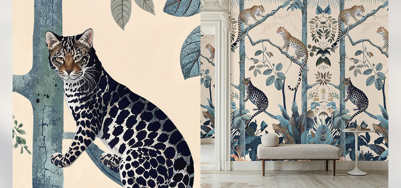 Embrace the luxurious warmth of “Panthera Gold,” a sumptuous gold jungle leopard wallpaper that is the epitome of an elevated tropical wallpaper. Crafted with an eye for intricate illustration detail, this high-quality wallpaper showcases majestic leopards lounging amongst rich, gold-infused foliage, creating a composition that radiates sophistication. The “Panthera Gold” gold jungle leopard wallpaper lends itself to a diverse range of interior design schemes, from the ornate and glamorous to the sleek and modern. Perfect for those who desire to add a touch of opulence to their surroundings, the “Panthera Gold” gold jungle leopard wallpaper is a versatile choice, guaranteed to infuse any space with an air of exotic elegance and a hint of designer intrigue.