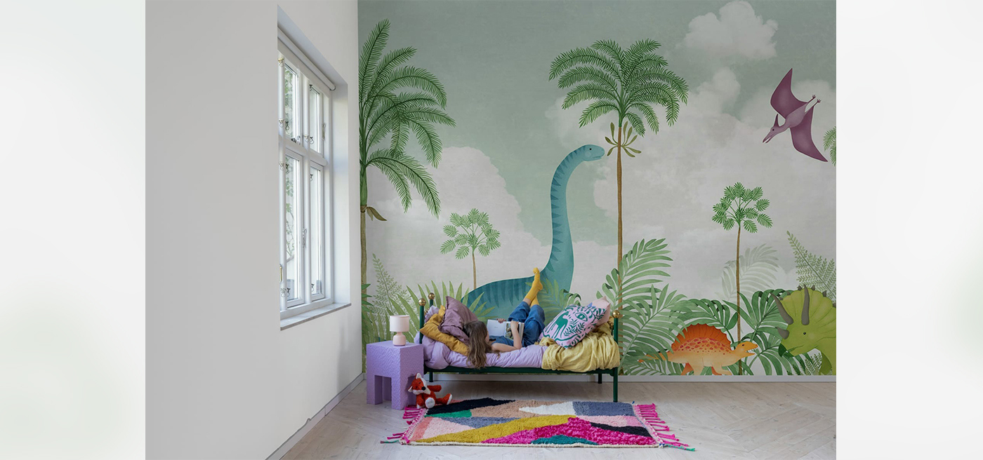 Discover a playful and beautiful jungle filled with exciting prehistoric animals painted in aquarelle. This design sparks the family's imagination, creating the perfect backdrop for play and family unity. Dinosaur World, Gray, creates a soft, magical world in soft hues of gray, green, white, and brown.