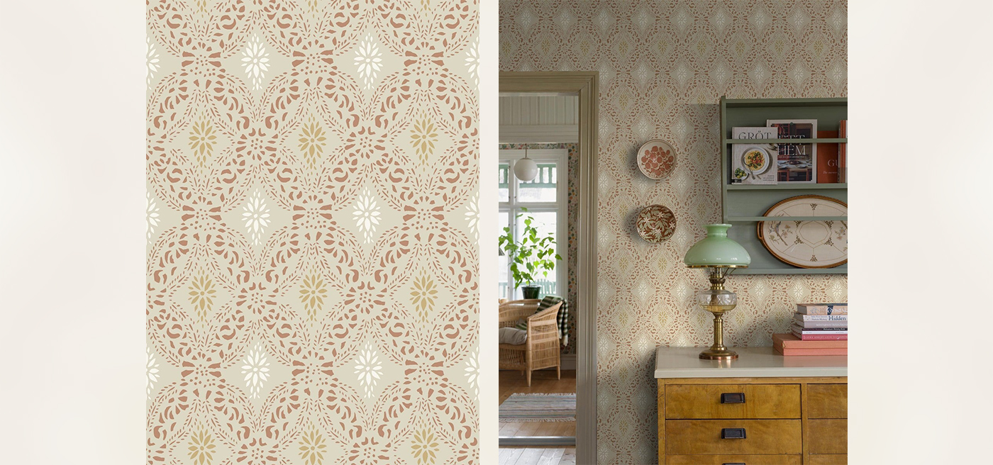 Eye catching and timeless, our Kvarnholmen wallpaper draws inspiration from a stencil held in Kalmar County Museum’s collections. With a soft grey backdrop and delicate lace-like forms in blue, red and green, this design reflects the original 1800s palette which was often created with natural earth pigments.