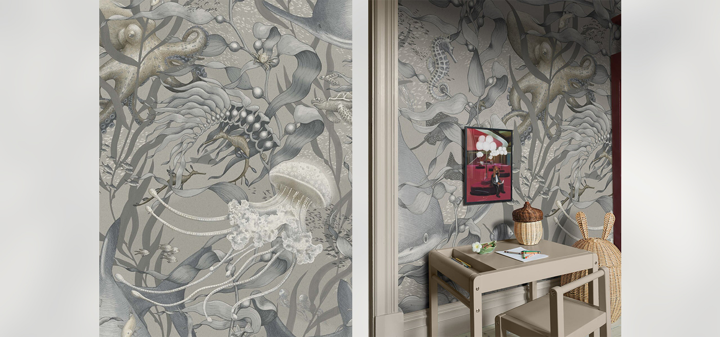 Underwater Magic Grand is an enlarged digital print of our popular children’s wallpaper Underwater Magic. A magical underwater world with octopuses, turtles, seahorses, sharks, and other beautiful details – now on an even more magnificent scale.