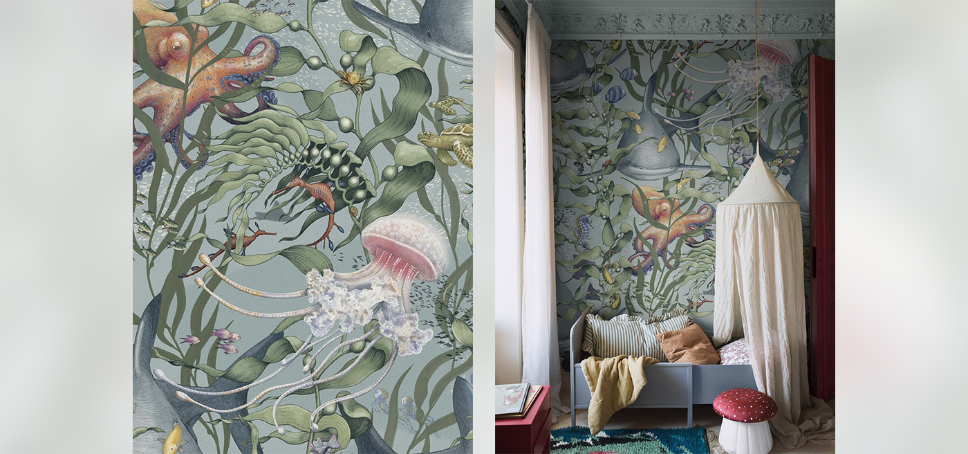 Underwater Magic Grand is an enlarged digital print of our popular children’s wallpaper Underwater Magic. A magical underwater world with octopuses, turtles, seahorses, sharks, and other beautiful details – now on an even more magnificent scale.