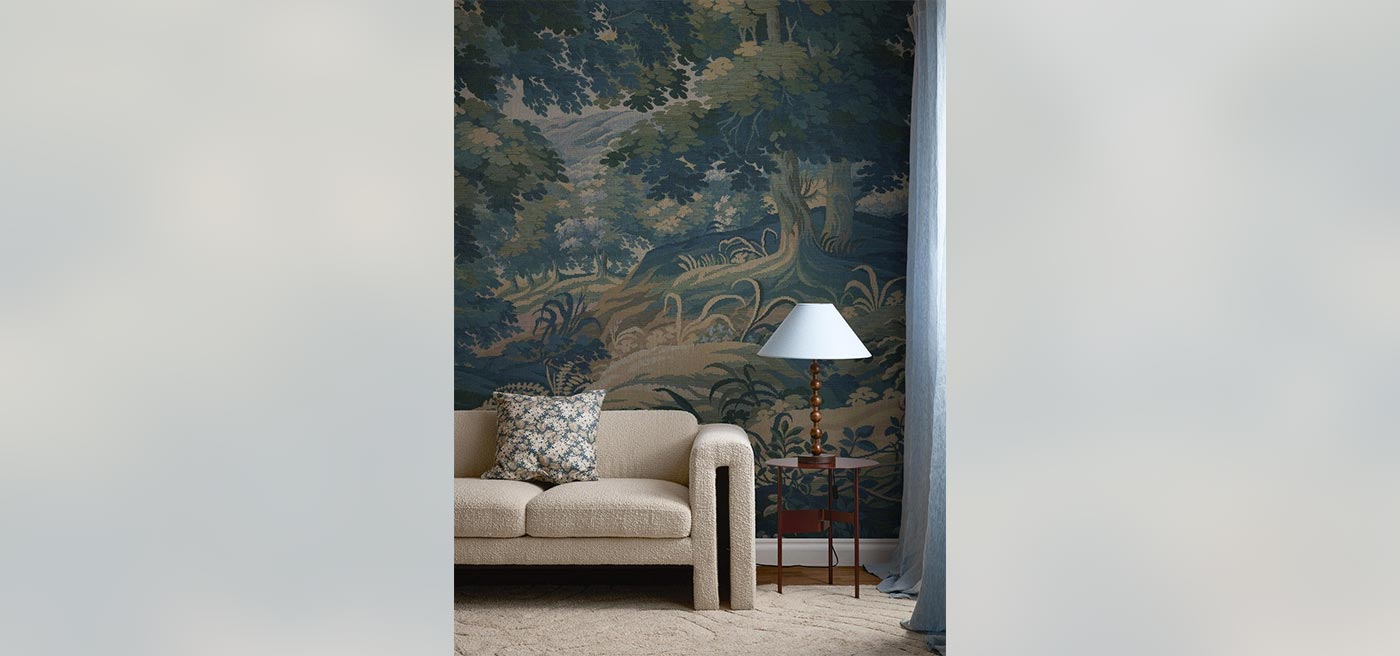 This wallpaper comes in an atmospheric palette of green, yellow-beige, blue, brown, and turquoise tones. The wallpaper is digitally printed and custom-sized to fit your wall.