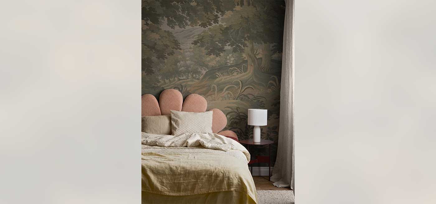 A rolling landscape with stunning depth stretches across the Tapestry Landscape mural – from delicate foreground flowers to lush tree canopies and hazy blue hills in the distance.