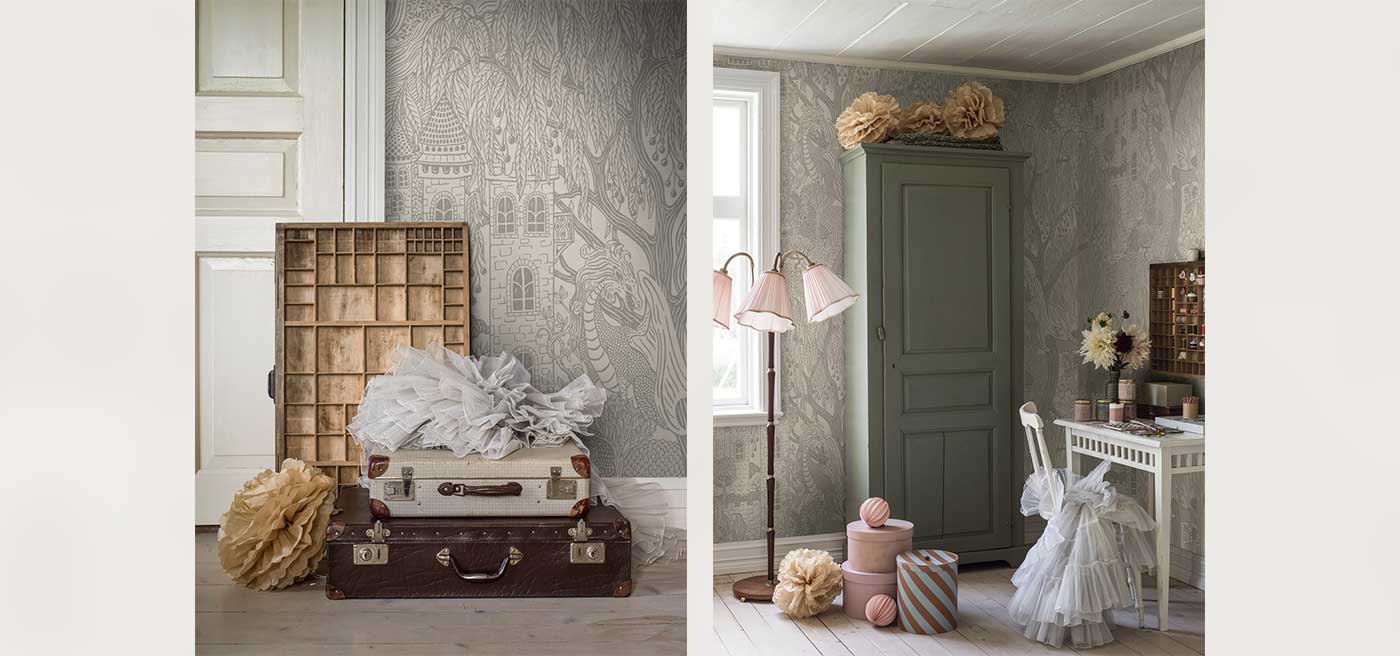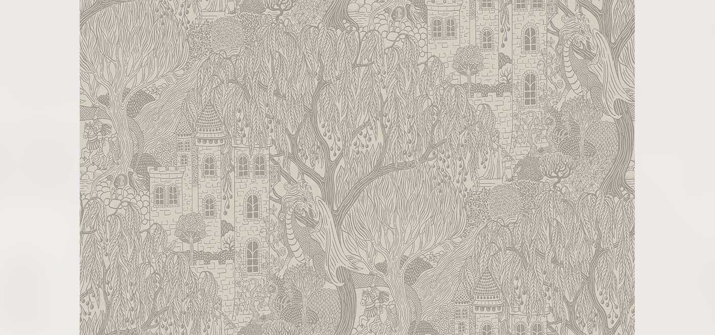 Kingdom of the Willow Grand is an enlarged digital print of a magical, hand-drawn children’s wallpaper, here in grey on a natural-coloured base. In this large scale, the detailed pattern wraps the entire room in a playful fairytale forest with princes, princesses, dragons, and knights. So many exciting details to explore!