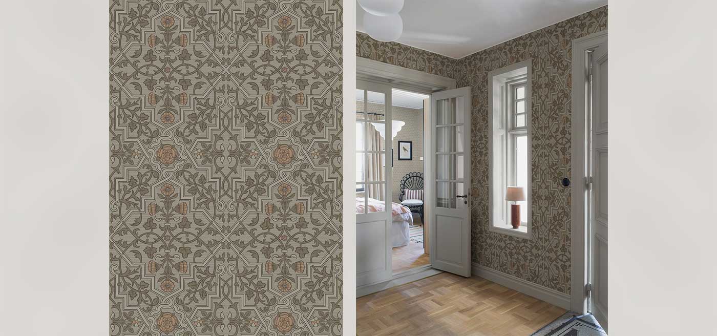 The Rosenvinge Grand wallpaper is an enlarged reprint of the beautiful 16th-century Rosenvinge, Sweden’s oldest preserved paper wallpaper. This intricate floral ornament is now available in large scale, as a mural customized to your wall or ceiling.
