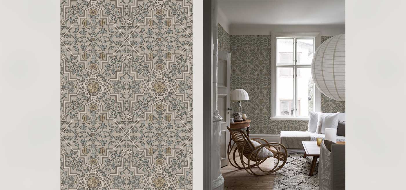 Here, Rosenvinge Grand’s floral ornaments come in a soft, refined palette with blue-green leaves and pale yellow flowers on a beige background.