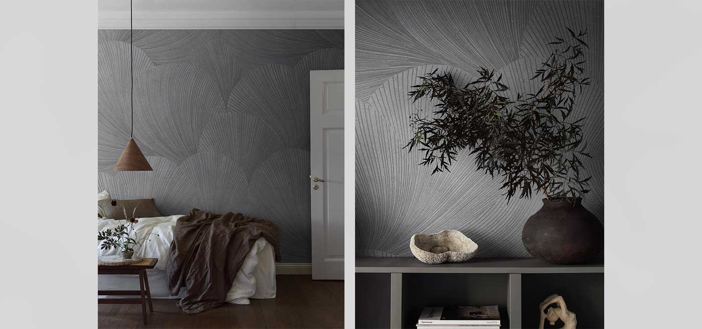 The Mirage Grand wallpaper is an enlarged digital print of the graphic Mirage design. Its soft lines create an illusion of volume and movement – a grand, dynamic pattern influenced by both Asian design language and Swedish flora.