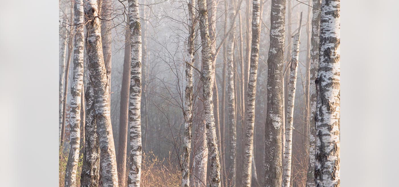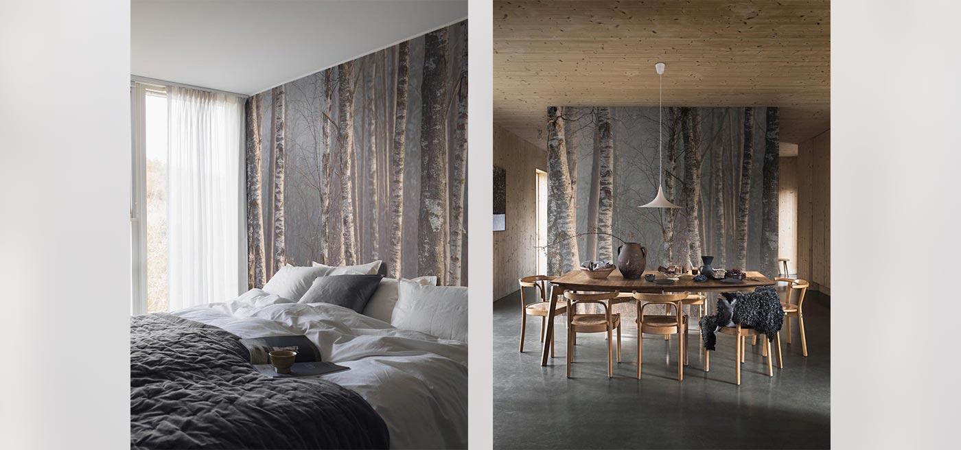 Want to bring nature into your home in a more graphic way? Then a photo wallpaper with birch trunks is a great choice. In this mural, the birches’ characteristic black and white patterns are wrapped in a silver-grey veil of mist. The near-monochrome expression makes this wallpaper especially fitting for a Scandinavian minimalist interior.