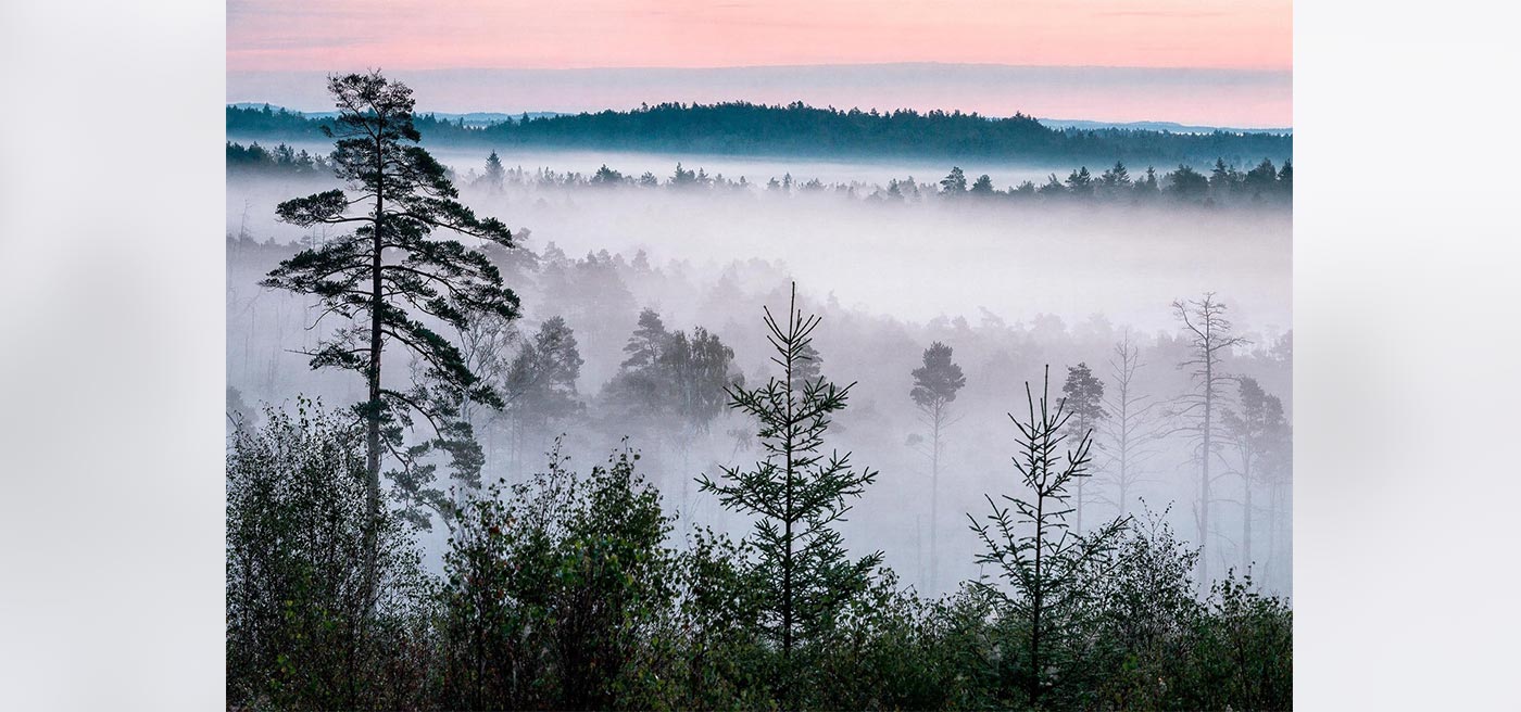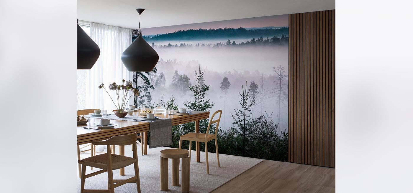 When night hasn’t quite let go yet, the blue hour arrives. In this moment between night and day, the sky is filled with a deep, soft blue hue, and the air becomes mysterious. That moment is captured here, with a sea of fog resting between treetops. This wallpaper is perfect for spaces where you want to create calm and stillness — like the bedroom or living room.