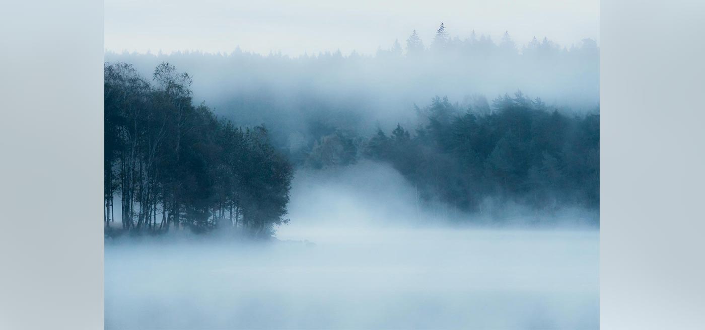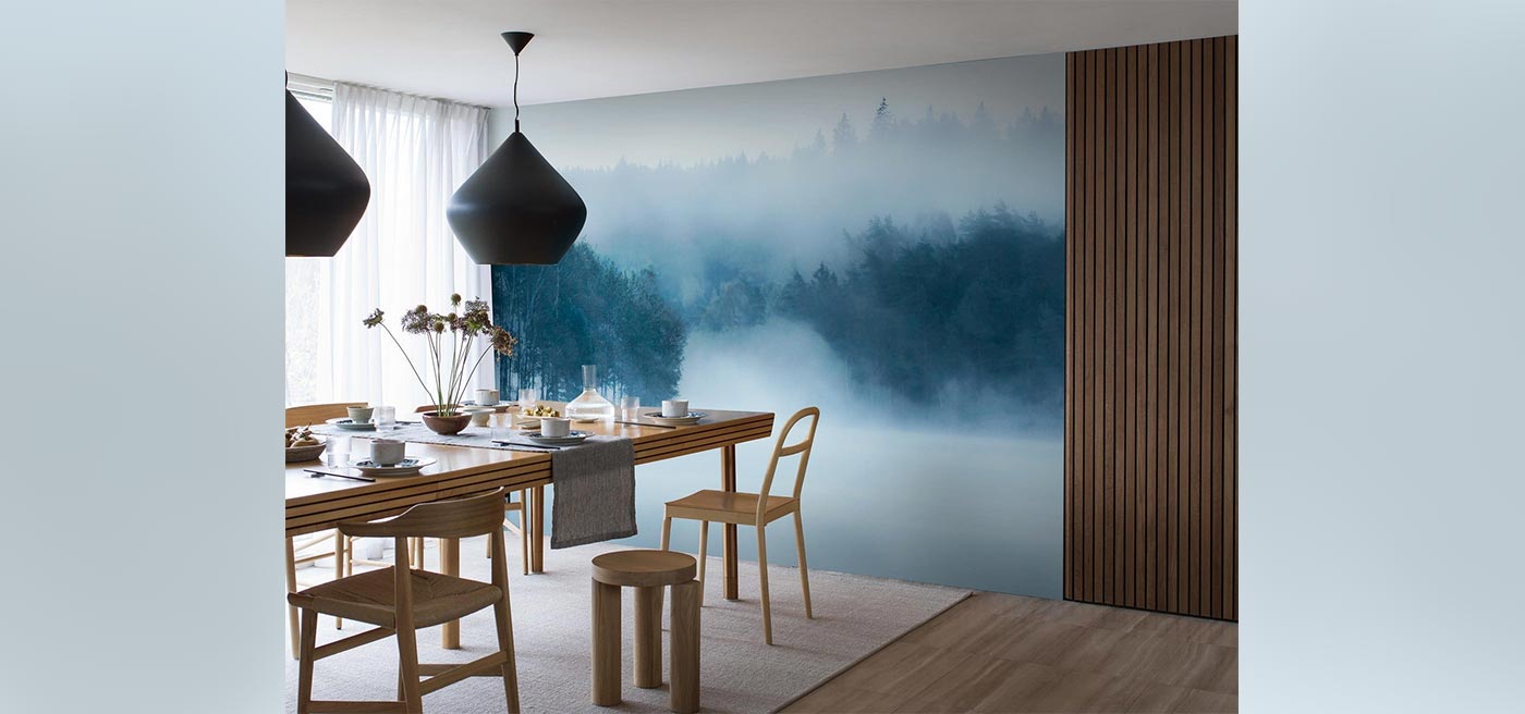 Stillness, mystery and a dreamlike feeling define this scene, where mist drifts through the forest and over the glassy lake. The moment was captured at Stora Delsjön in the stunning natural setting of Delsjöområdet — a perfect picture of Scandinavian nature. The soft, diffuse quality of this photo wallpaper gives the landscape an almost abstract expression, making it a perfect fit for any room in the home.