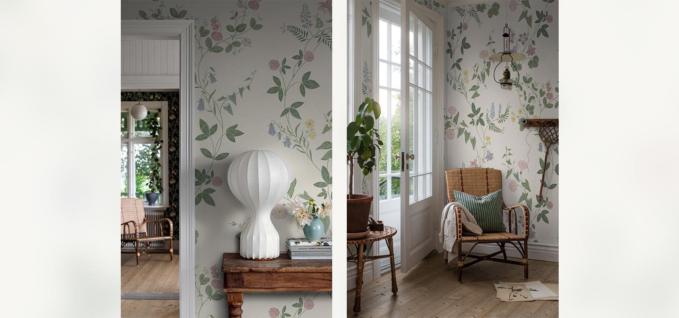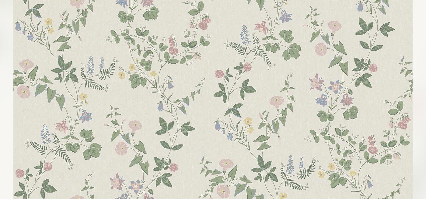 This wallpaper is an enlarged digital reprint of the hand-painted Midsummer Eve design. The large scale gives the charming pattern a slightly bolder character.